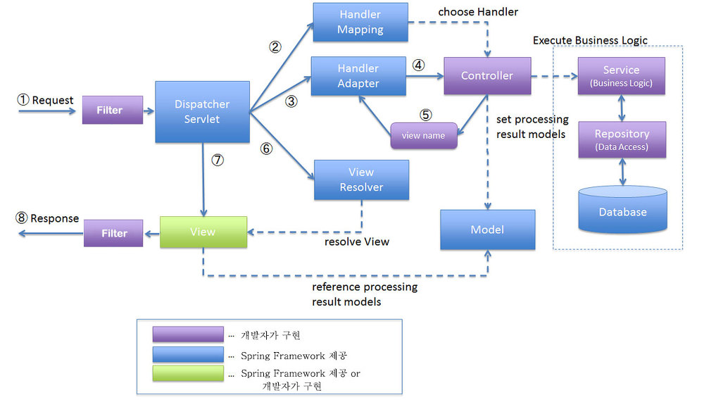 5. Controller에서는 전달된 요청을 처리한다. 예를 들어 게시판의 글 목록을 가져오는 요청을 받으면 controller는 게시판 service를 호출하고 service에서는 dao를 통해 게시판 글 목록을 가져오게 된다.